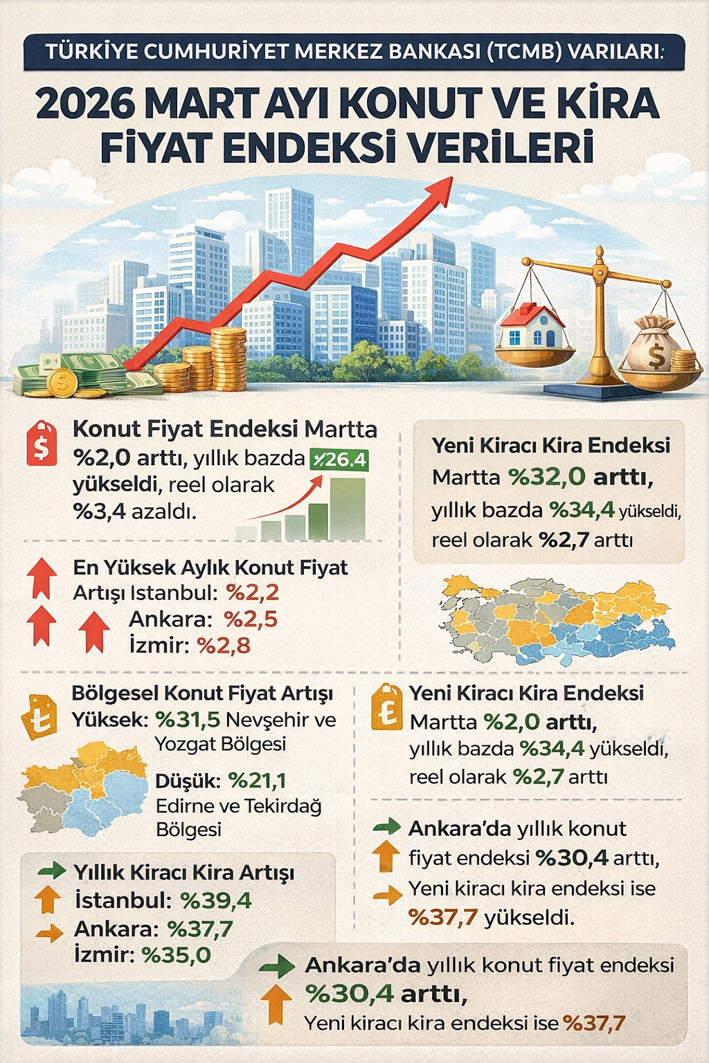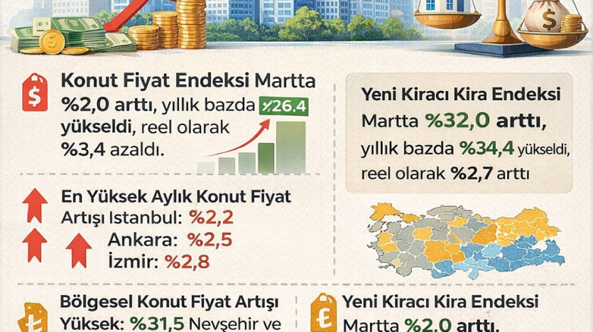 Türkiye Cumhuriyet Merkez Bankası (TCMB) tarafından açıklanan 2026 yılı Mart ayı Konut Fiyat Endeksi (KFE) verilerine göre, Ankara’da konut ve kira fiyatlarındaki artış devam etti.